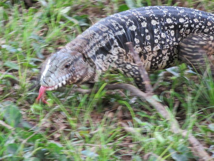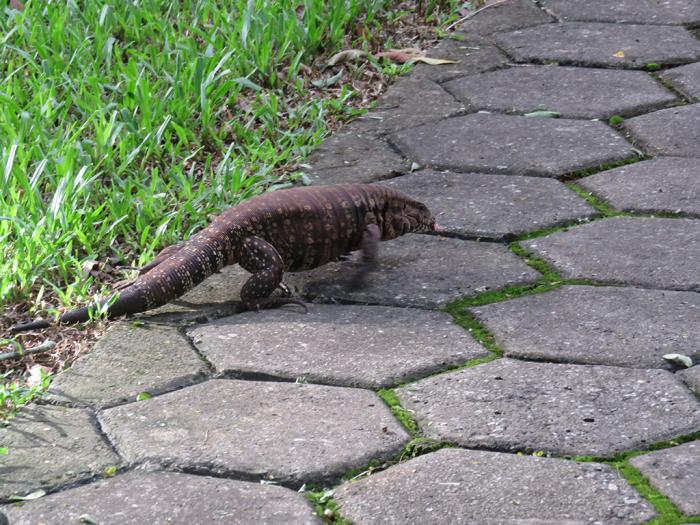 小路很长,大约两公里。看看前面还是没有头。列宁同志突然有些内急,赶紧往回走。等出了这片林子,他又不急了。怎么回事儿?原来看到了在路上慢慢爬的巨大的蜥蜴。这下来劲儿了,像个孩子似的拿着相机追着照。追到草丛中,发现巨蜥还不止一个,还有更大个的。这下他更兴奋了。咔咔咔一个劲按快门。回来还一直说,看看,咱照的这些,全毙。大伙看看下面的照片就知道他照着什么了。