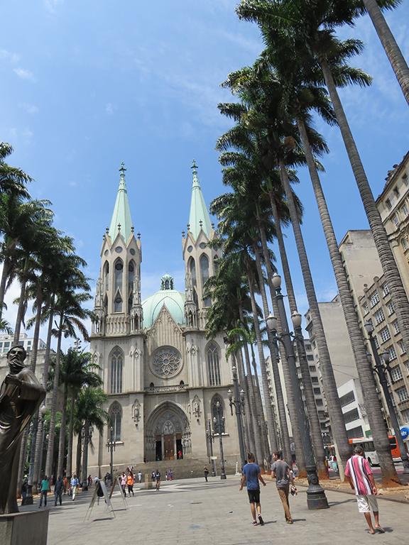 可能是周日,又是狂欢节假期,街上几乎没什么车,不像网上说的那么邪乎。转眼间到了大教堂。一下车,就听见列宁同志惊呼,嘿,瞧那些树!只见两排笔直挺拔,直入云端的棕榈树矗立在教堂前广场的两边,和那雄伟气派的教堂,高耸入云的钟楼遥相呼应,又像两队英俊威武的壮士,在教堂两侧守卫.