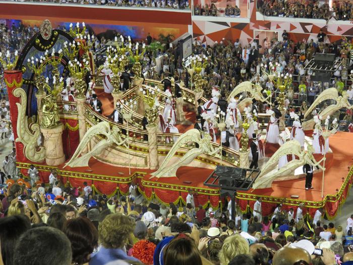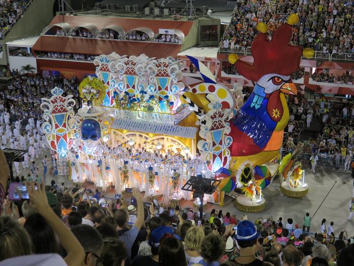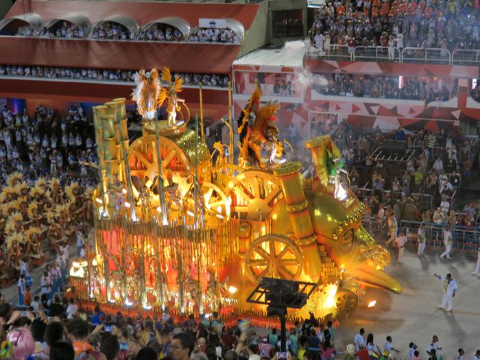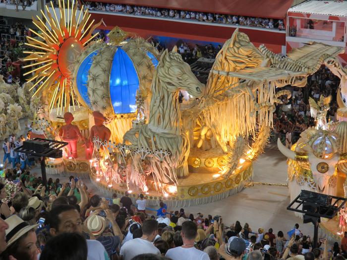 游行开始了,音乐一响起,所有的人都站起来了。我们也只得站起来,不然什么都看不着啊。先是2016年夏季奥运会的宣传彩车。接着随着热烈的桑巴音乐,第一辆彩车过来了。看台上立刻沸腾起来,无数相机在拍照。震耳欲聋的鼓声敲得人心脏都要蹦出来了,欢快热烈富有节奏的桑巴使人不由自主地跟着扭摆。歌声,欢呼声,叫好声响成一片,看台上的人都在随着音乐舞蹈,我真正感到了什么是狂欢。