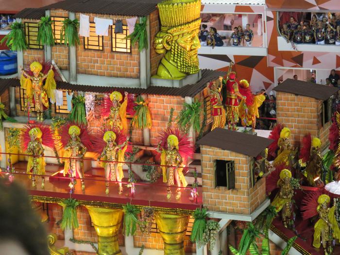 听说每个桑巴舞学校上场参赛的人数为3800至4000人,分成32个方队,方队之间还设有多辆彩车。参赛内容和配唱歌曲都要有故事情节,全队服饰都要根据表演情节设计。一辆辆彩车慢慢驶过,我从来没有见过装饰得如此豪华的彩车,简直就是一座座行驶的宫殿!演员的服饰也令人瞠目结舌,一队队上百人的方队身着同样的华丽服装,特别是那些高大的羽毛帽子,真不知演员的脖子怎么能承受得住。列宁同志则一直在唠叨,这可得花老鼻子钱了,老鼻子了。。。可能想起了1918年时连面包都没有的艰苦时代吧。