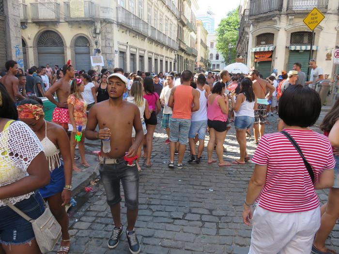 果然,来到一个聚会地点,人山人海,原来人都跑到这里来啦!许多人化着妆,女人们穿着袒露的衣服,男人们大都光着上身。许多男人穿着女人的衣服,扮成女人的样子。据说巴西狂欢节对女性化的狂热程度在世界上可以说是独一无二的。有的男人希望自己拥有女性的特征,狂欢节中常常出现“易装癖”,这是历史的产物。