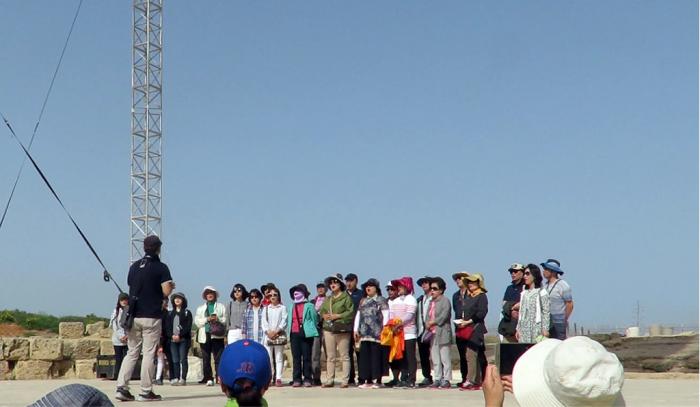 来自世界各地的游客在以色列的古罗马遗迹上观看中国游客合唱。