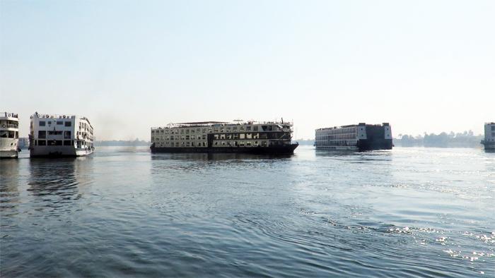 游轮向卢克索航行。在甲板上看到几条小船用绳子栓在游轮上,让游轮拖着走。