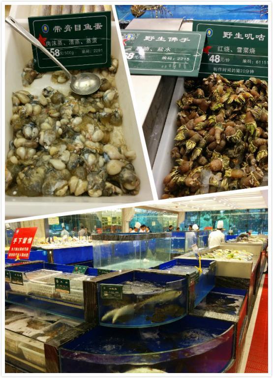 进得店来,服务员带着,先去看生猛海鲜食材,边看边点菜。
