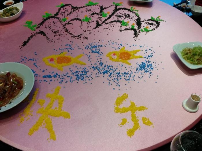 餐桌上有彩色的小颗粒摆的像画一般。