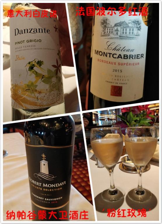 意大利白皮诺、法国波尔多红酒、纳帕谷蒙大卫酒庄红酒。最后一晚点了两杯‘粉红玫瑰’(Rosé ):