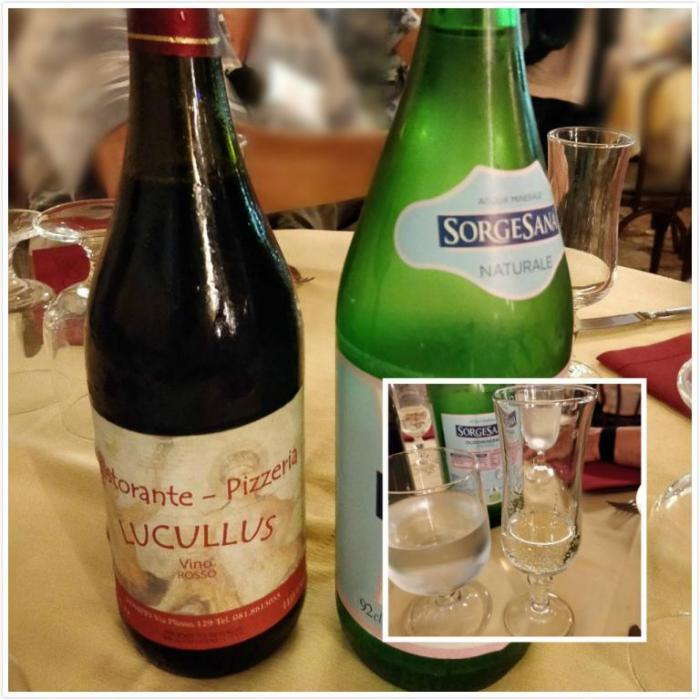 每张桌上放了一瓶意大利红酒,一瓶瓶装水: