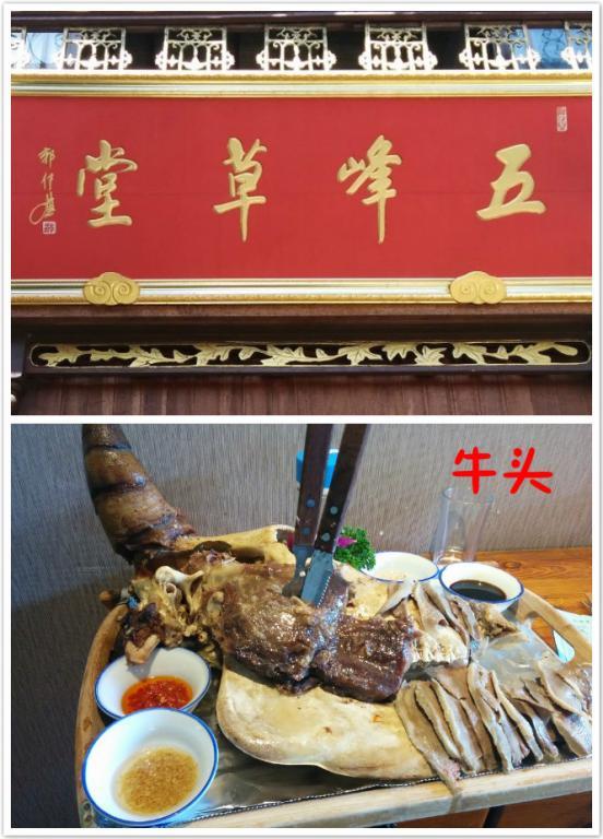 上面照片里的牛头,并不在匾额上。其实是俺就餐中间出来,看见这带角的牛头,大约是给隔壁包厢的。