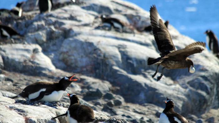 在企鹅孵蛋的地方也有很多大鸟。它们专吃企鹅蛋和小企鹅。船上的一个游客抓拍了这一张大鸟叼走企鹅蛋的照片。我们也常常听到企鹅妈妈悲惨的叫声。