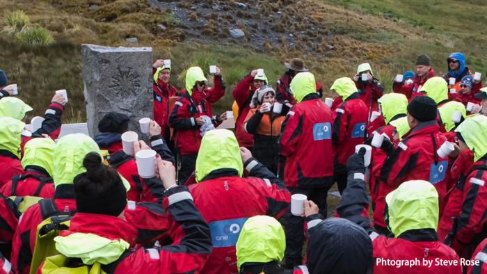 在沙克尔顿墓前手举香槟向英雄致敬。