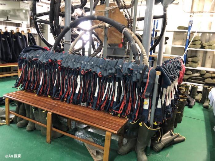 更衣室是每次下船登橡皮艇都要停留的地方。在这里换上防水靴和救生衣。照片里是玩皮划艇要穿的外套。