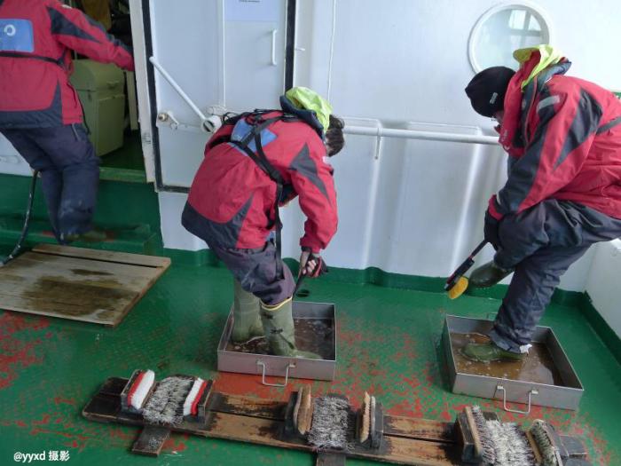 每次登陆回来,要在更衣室外用消毒水将靴子和外衣刷干净。