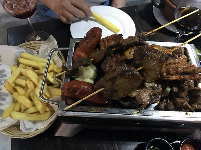 在旅馆后面的步行街看到一家智利餐馆门口的照片,是烤肉!智利烤肉是很有名的。不吃烤肉不是白来智利了?再说菜单还有照片。两人二话没说,进!