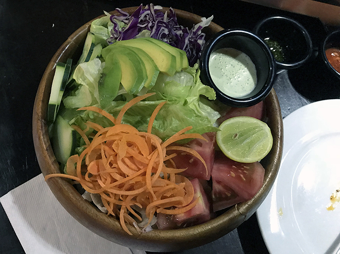 一会,菜上来了。我们吓了一跳。一大盘烤肉,一大盘青菜沙拉,一大碗汤,还有一盘薯条。这么多,足够5、6个人吃的。