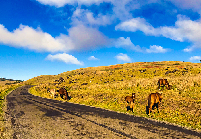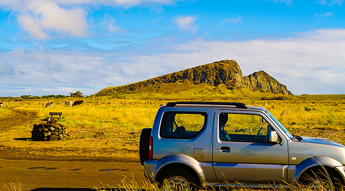 复活节岛的形状像等腰三角形,又像个草帽。但是只有这个三角形的左下角的安加罗阿Hanga Roa和周边有人居住。别处也要开车才能去。