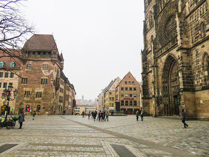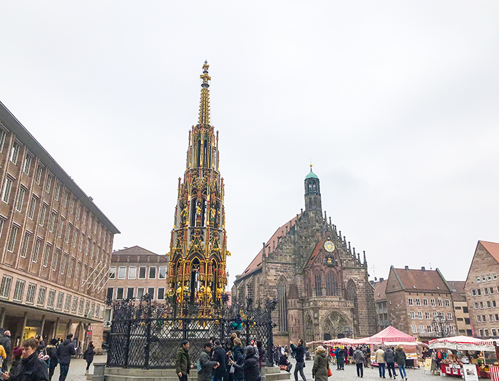 集市广场也称圣诞广场,是纽伦堡一景。可见圣母教堂和美泉。其实这个广场并不大。可能是冬季,也没有多少商家在卖东西。