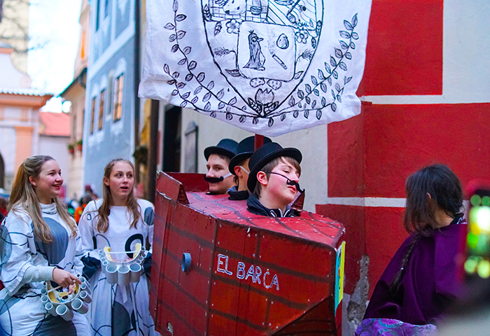 化妆面具队伍敲锣打鼓地走进了我们下午参观过的修道院。在院子里还挂上了大屏幕。一个演讲者开始讲故事,大屏幕上放幻灯。说的是捷克语,一句都听不懂。