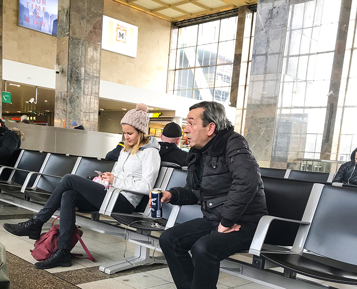 对过座位上等车的老哥喝着啤酒和他的两个同伴神侃,很是高兴。只是我们一句都听不懂。不然的话,列宁同志恐怕早已加入侃爷们之中了。