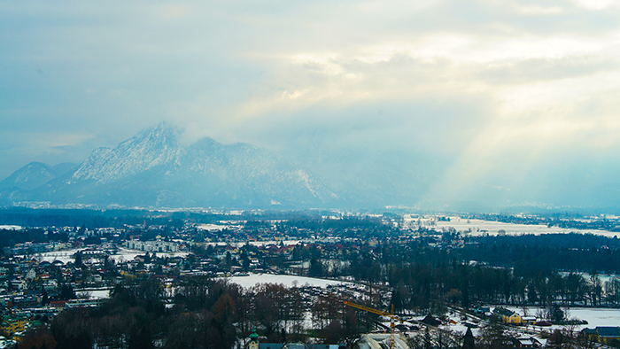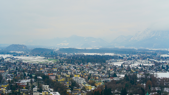 乘缆车到达山顶。俯瞰在二月里灰蒙蒙的天空下的萨尔兹堡。