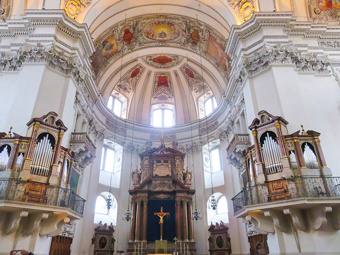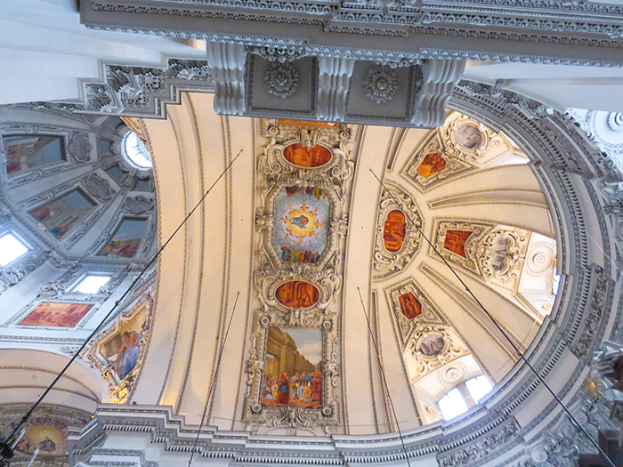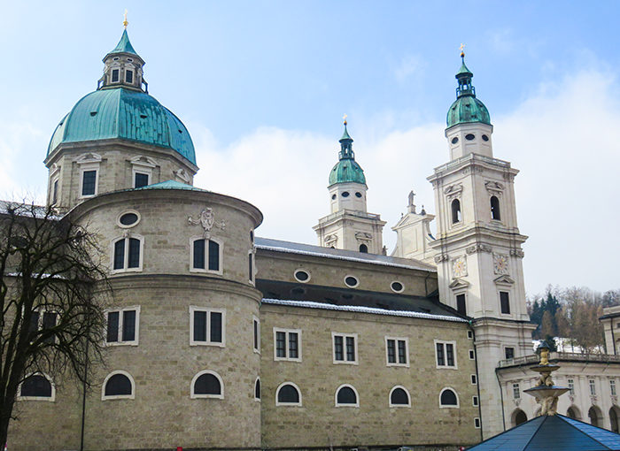 从要塞山下来,走到了萨尔兹堡大教堂。公元774年,这座巴洛克式主教坐堂建成。这就是从要塞山上看到的圆顶教堂。