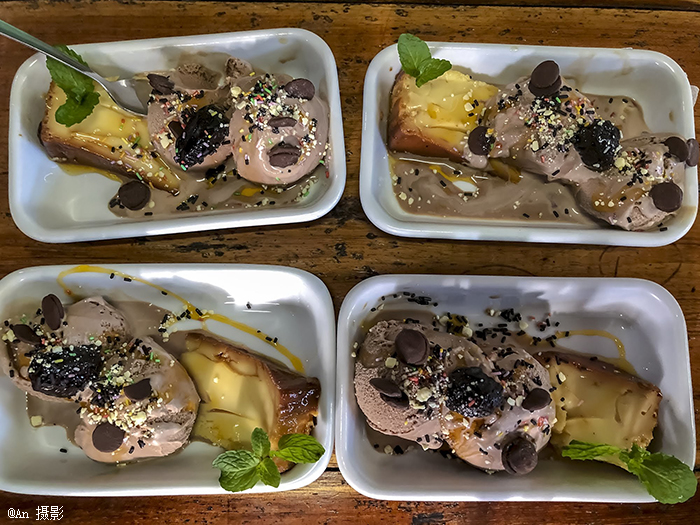 一顿饱餐,已经是不能动弹。老板又问我们要不要甜食。我们有很好的冰激凌,很小的一份啦,尝尝吧。
