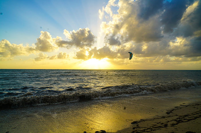 说是海滨的日落很美,但是还没等到日落,黑云就压了上来,眼看暴风雨就要来了。几个人只得恋恋不舍地离开。只有那风筝冲浪人还在夕阳中搏击。
