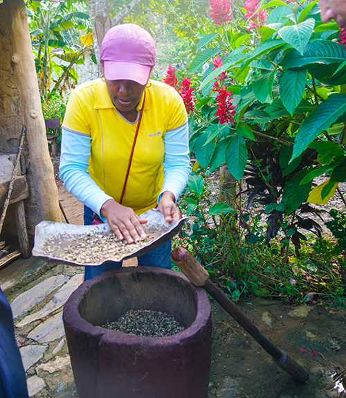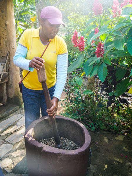 将晒干的咖啡果放在缸里捣,将干皮捣碎。