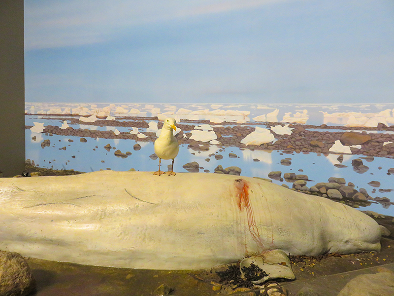 导游说,白鲸的标本很不好做,因为它的皮肤很滑。博物馆也不会为了制作标本而杀害白鲸。这头白鲸不知被什么动物伤害而死,博物馆有幸将它做成了标本。