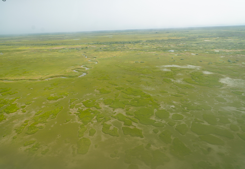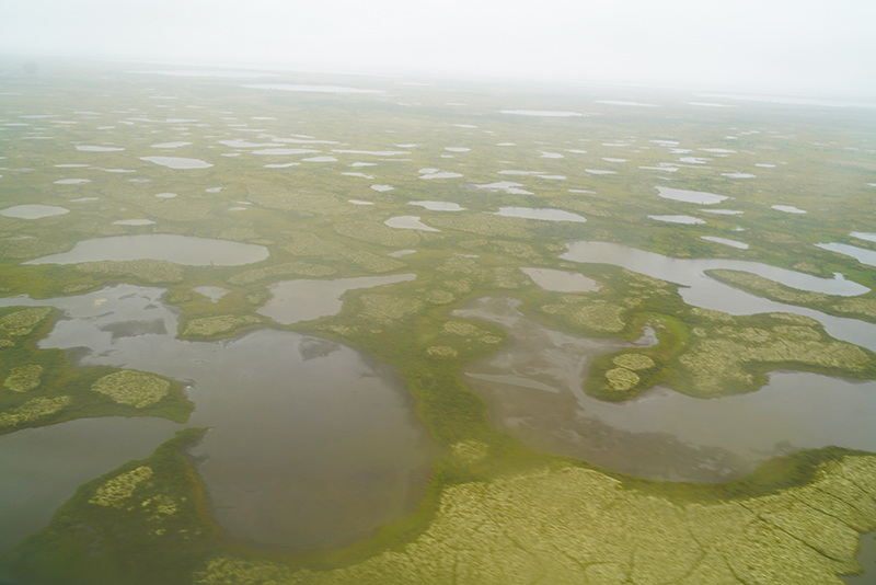 从空中看,夏季的苔原布满了绿色和白色的苔癣地衣,还有无数的水洼,广袤无垠,竟是如此壮观。
