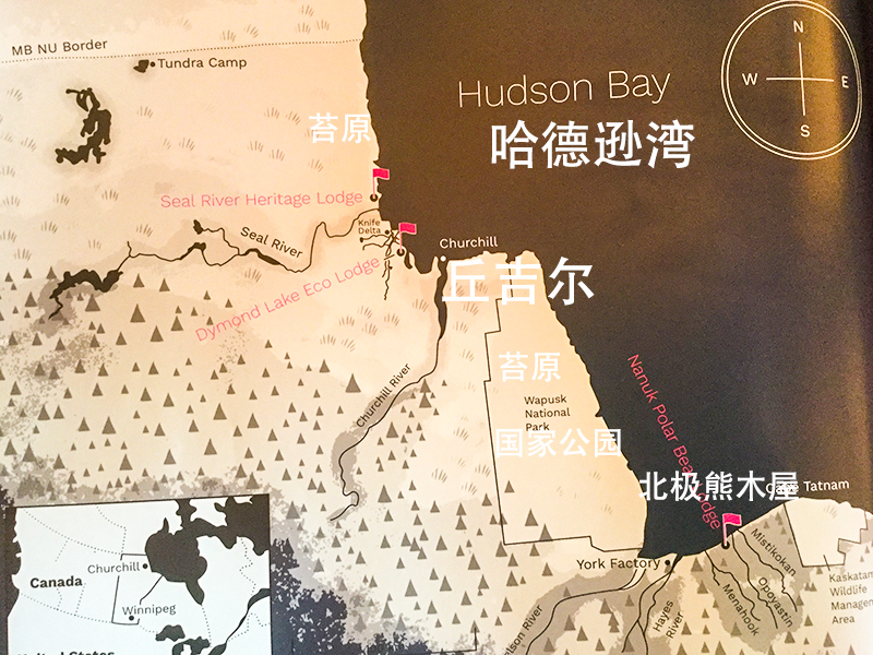 后来看到这幅地图,才弄明白了。我们去的北极熊木屋在丘吉尔的南边。从丘吉尔到木屋,飞机要飞过处于苔原地带的国家公园。我们在飞机上才看到了真正的苔原。