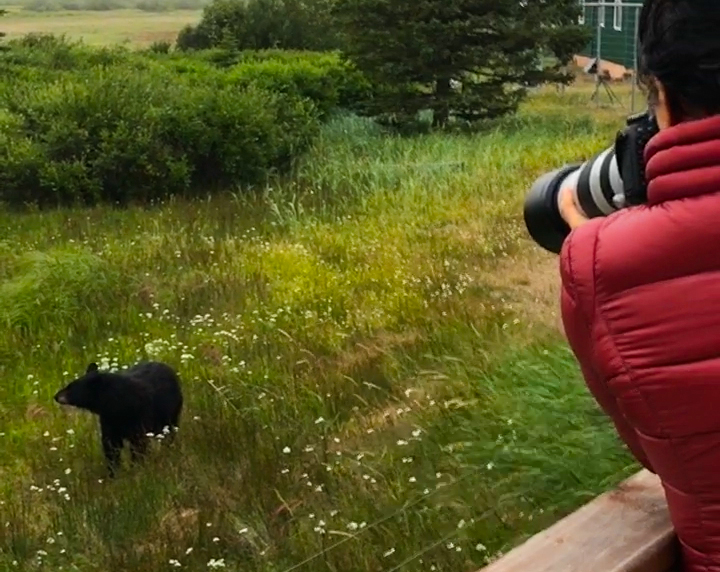 导游赶紧过来告诉我们,看到黑熊一定不要因为激动弄出太大动静,不要在屋子里快跑,因为黑熊可以听到地板震动的声音。也不要在窗内做快速动作。因为我们能看见黑熊,它也能看见我们。剧烈的举动有可能惊着黑熊。