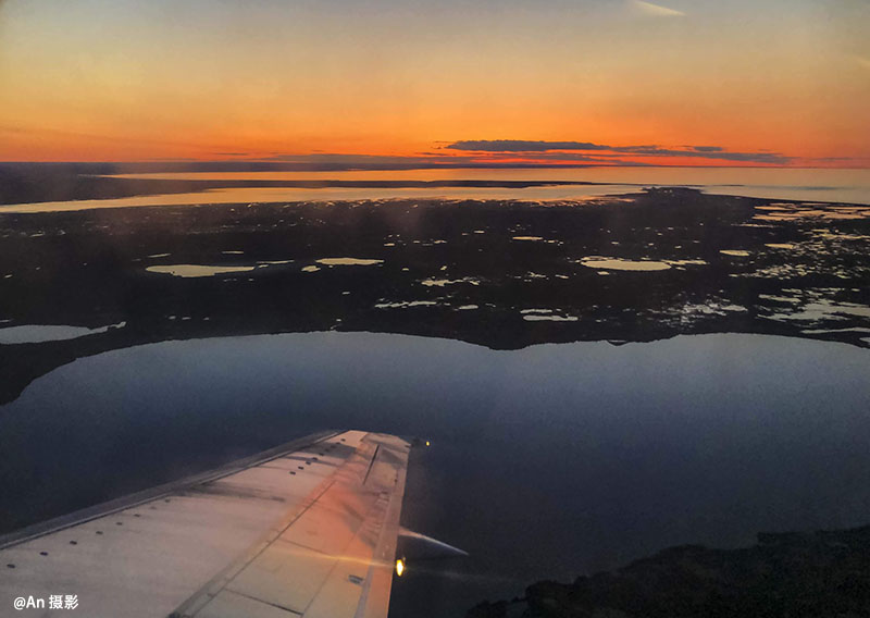 丘吉尔的夏日白天很长。当我们的飞机起飞时,已是晚上9点多钟,太阳却才刚刚落下,留下绚丽的色彩。