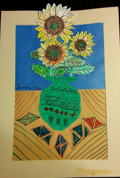 一个例子是学生美术作品的学区评奖和展览。小小阿立一幅学梵高风格的作品学区得奖,好像在本地区(两城一镇)的图书馆展览。我们去拍了照片。