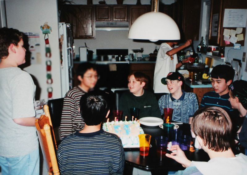 小阿立不怎么喜欢保龄球,也没玩过溜旱冰。所以生日爬梯往往是一大帮孩子来我们家,玩各种纸牌游戏啊,租个带子看电影啊,等等。食物依然以订披萨为主。