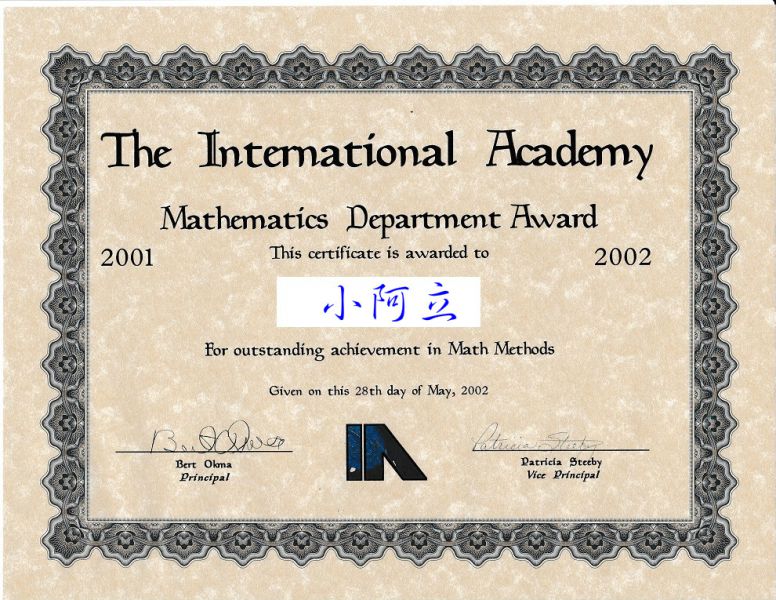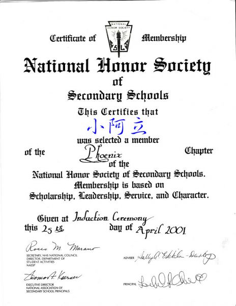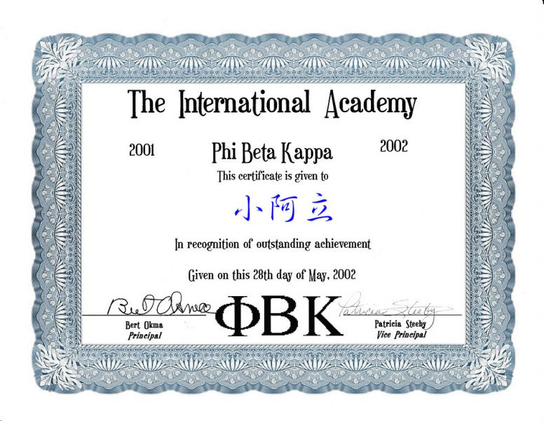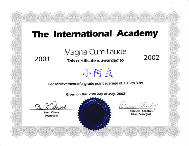 小阿立好像没觉得难。回家作业稍微有一些,从未见他忙乎。人虽聪明,考试却懒得仔细检查。每次都是早早交卷。如有错误,不是不会做,而是不仔细。虽然每学年也都是优等生(Magna Cum Laude),平均成绩(GPA)3.75-3.89;不是最优等的(Summa Cum Laude)。