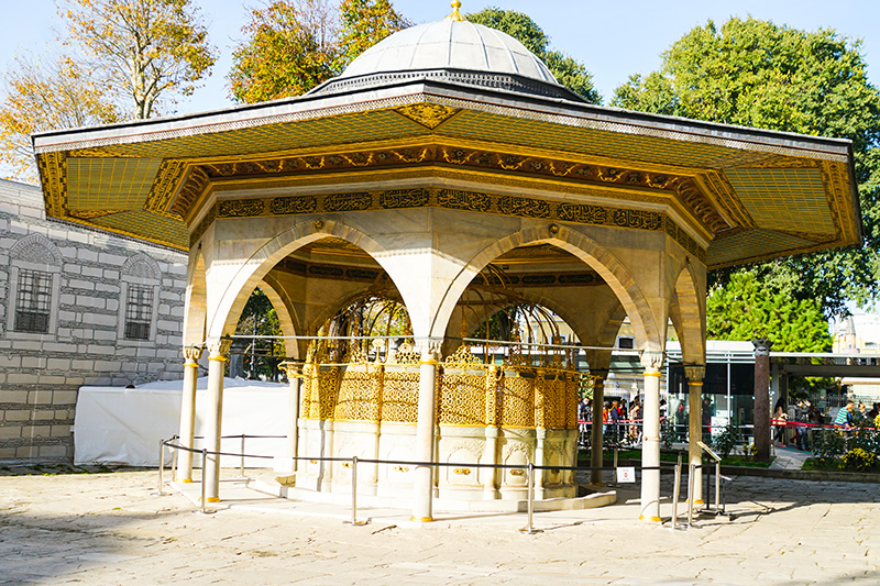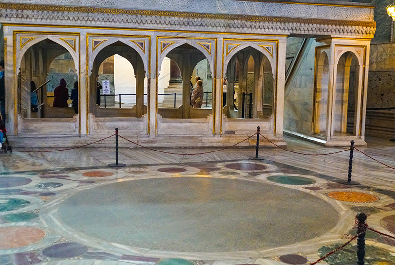 供宣礼官员使用的凉廊和布道讲台。前面是彩色大理石装饰的地面,这个地方被称为“世界的肚脐”,据说历任苏丹就是在这个地方被加冕的。