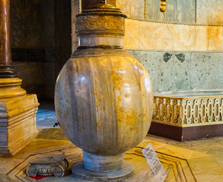 清真寺中的壁龛(米哈拉布),位置正对着东方麦加的方向。两侧各放一个古希腊汉白玉大瓮,