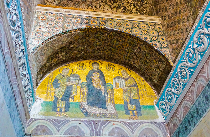 这是在教堂门口上方的原始壁画,创作于公元10世纪。画面右边的君士坦丁大帝正在向手托幼年耶稣的圣母玛丽亚奉上伊斯坦布尔,画面左边的查士丁尼一世则献上圣索非亚大教堂。