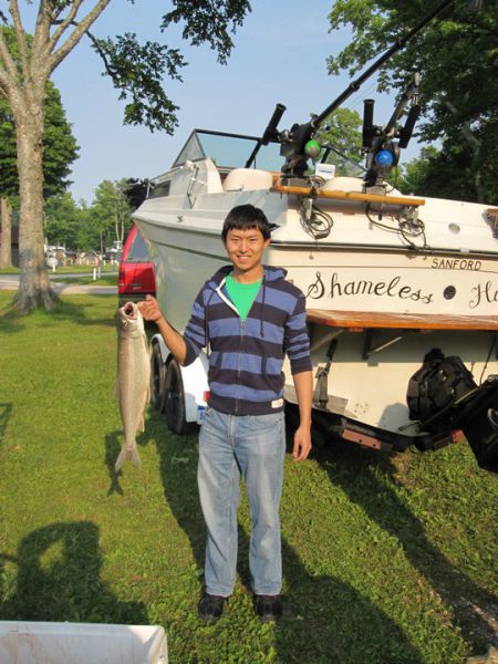 美国孩子动手能力强,女的也是。大鱼钓上来,刷刷刷几刀,切头去尾、去骨,鱼片大大的一片一片切好了。