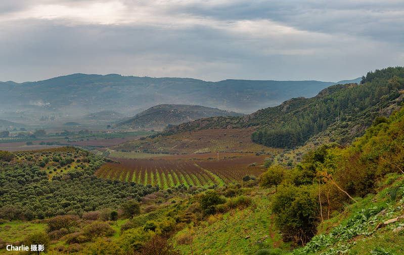 旅游车沿着山路向山顶行驶。导游指着山谷告诉我们,很久以前,这里曾经是爱琴海的一部分。后来,海水渐渐退去,这里便成了山谷,盛产水果。