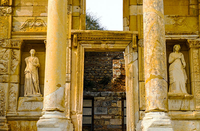 图书馆正面墙壁中有4座雕像,象征着智慧,知识,智力,和英勇,这些是塞尔苏斯的美德。雕像是复制品。原件于1910年被带到维也纳的以弗所博物馆。这是奥地利考古研究所参与挖掘工作的收益吧。