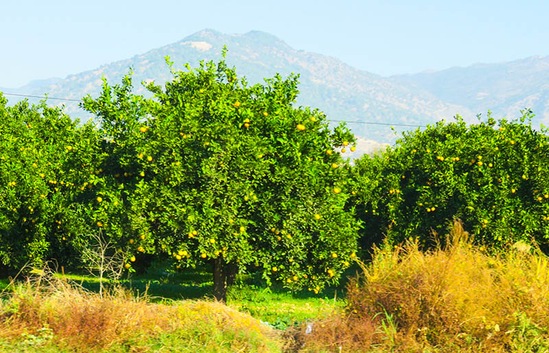 路边的桔子树上结满了桔子,好像伸手就能摘到。