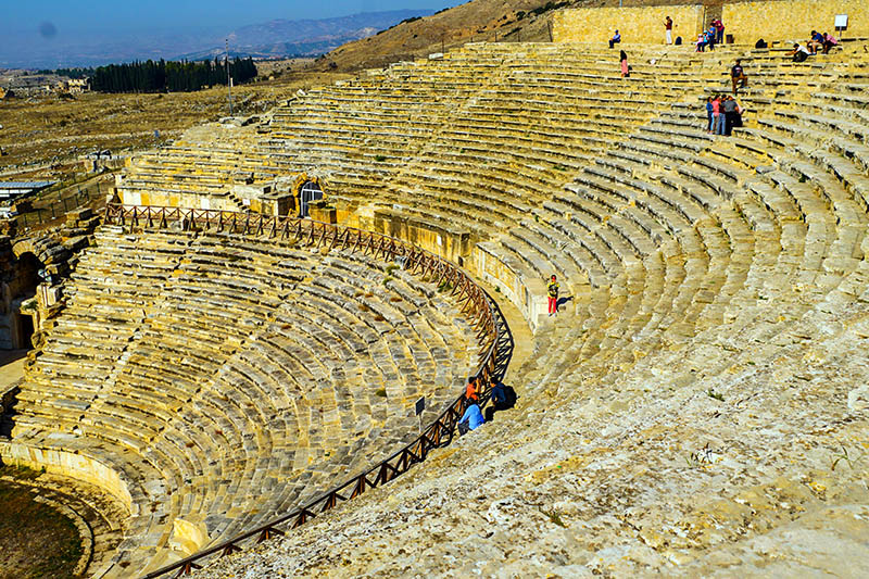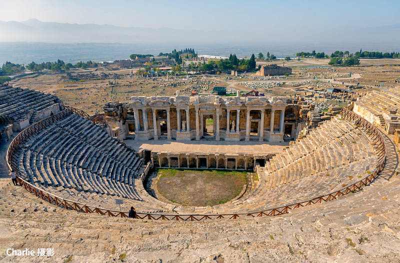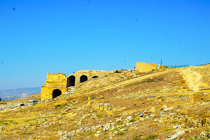 站在剧院顶层,整个古城遗址尽收眼底,大都是残垣断壁,碎石烂瓦,无一完整建筑。远处白花花的一片就是棉花堡温泉。