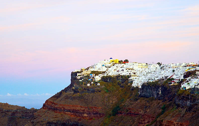 在淡淡的朝霞笼罩下,峭壁顶上的白色村落真是美极了。