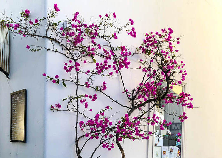 粉色的风情万种的小花衬托在白色的墙壁上,又是一幅水彩画。