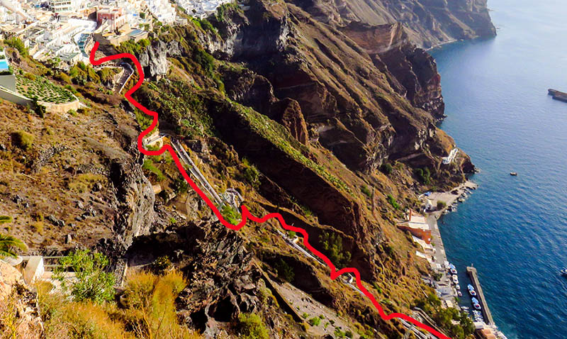 从悬崖的顶上下到山脚下的港口可不是件容易的事儿。俗话说,上山容易下山难嘛。尽管台阶很宽也不陡,但是走快了也眼晕。看看这张照片的红线标注的台阶,您就知道下山是多么不容易了。老太紧赶慢赶,还花了20分钟。