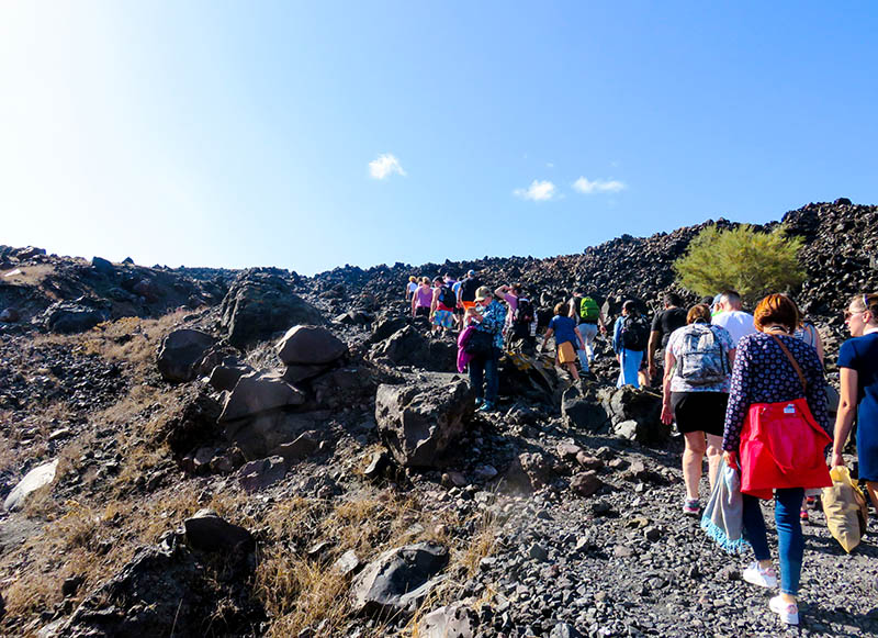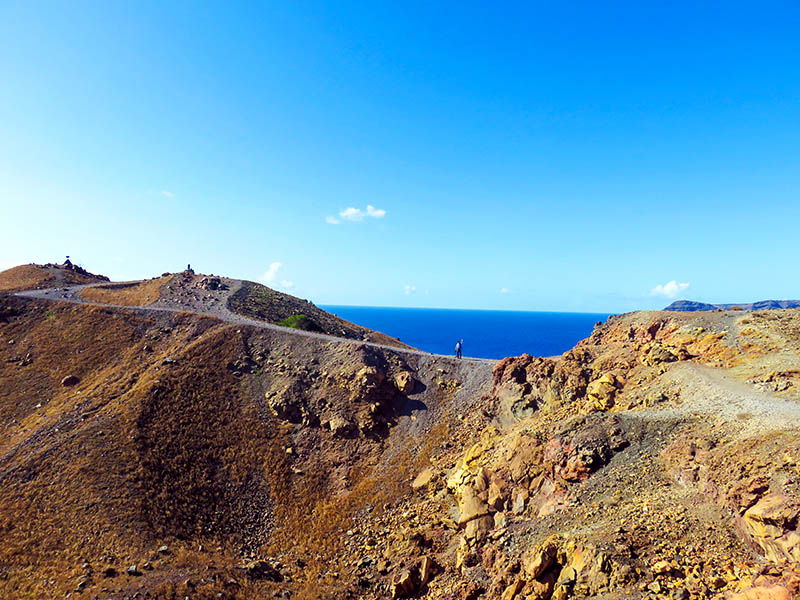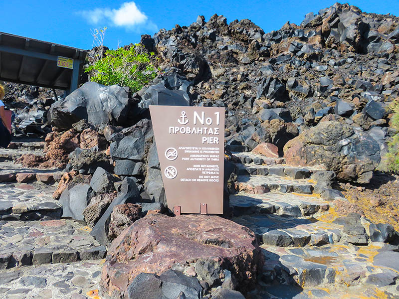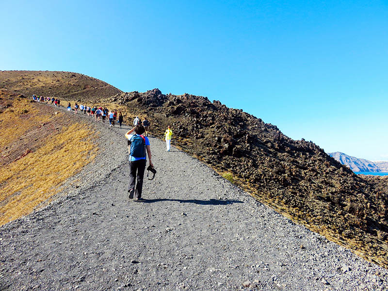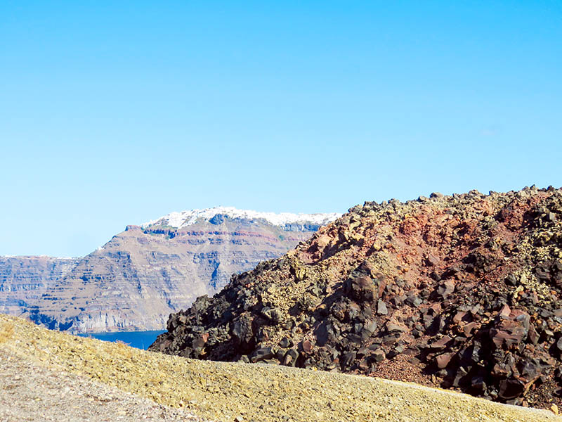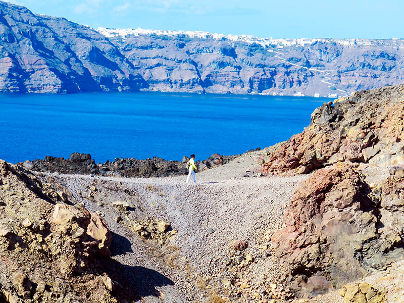 当时的火山灰和沉积物慢慢形成了现在的半月形的圣托里尼岛。半月形的中心是3个火山口小岛。我们要登上卡梅尼岛(Kameni Island)