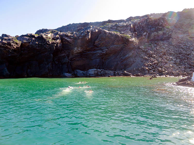 下山后,木船又载着我们来到了另一个火山小岛佩莱亚·卡梅尼(Pelea Kameni)的温泉。船上的年轻人都是有备而来,换上泳衣、泳裤,噗通、噗通都跳进水中。
