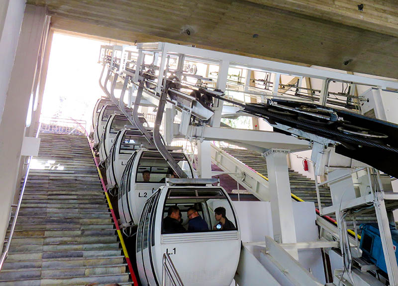 从木船上下来,再也没有力气爬上悬崖,回到市区,连骑骡子的力气都没有。好在有缆车上山。头天我们将缆车站和时间都打探好了,几个人买了票,登上缆车。