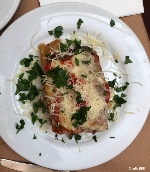 这是正宗的希腊名菜穆萨卡(Moussaka)。底层为切片土豆,第二层为橄榄油煎茄子,第三层是牛绞肉、洋葱和香料,最上边是奶酪,烤箱里烤熟。味道美极了!